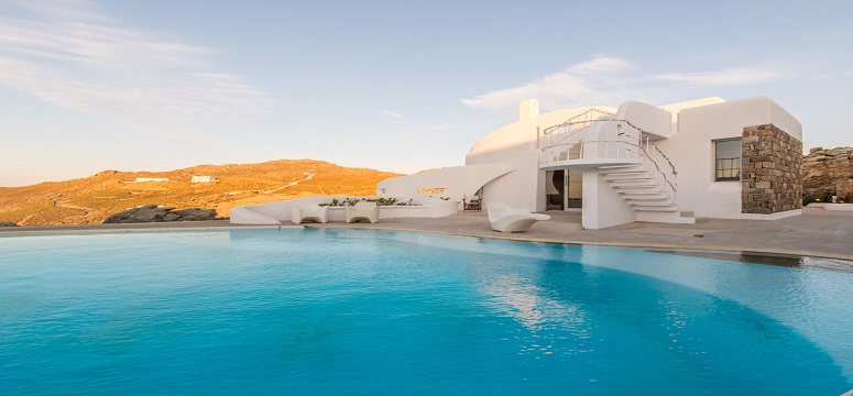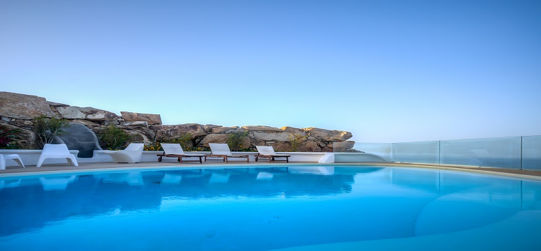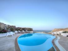 Villa Amethyst is located in the "Fanari area" in a distance of 5km from the Town of Mykonos and 6km from the island's international airport. In a plot of 4.000m2 we have created a 480m2 luxurious residence extending on three distinct levels. Well designed privacy and minimal aesthetics offer a unique experience of hospitality and recreation. The building's architectural design provides the option of choosing between one or -alternatively- two self- contained villas, each one with a separate exclusive access.